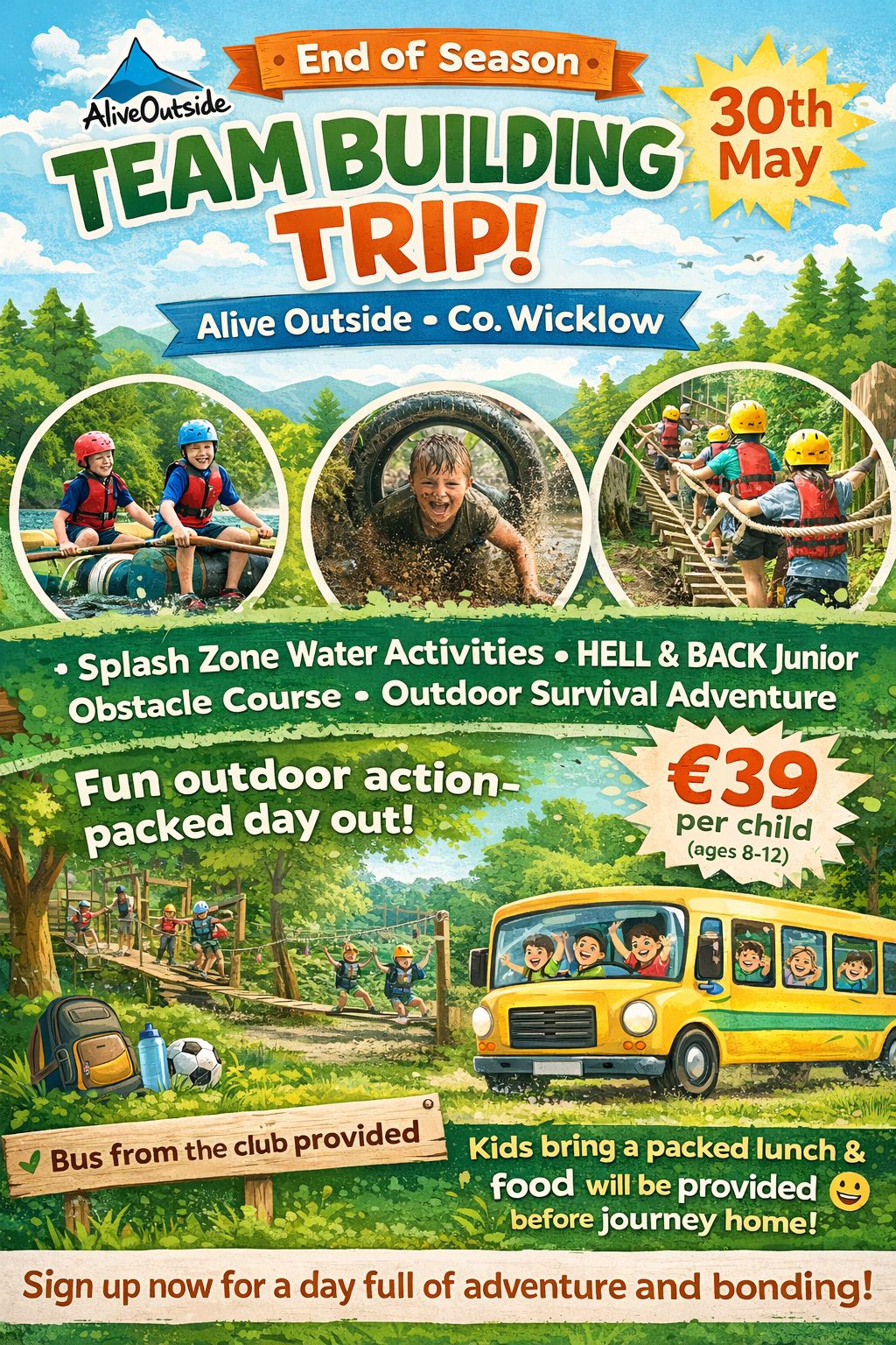SelectOur underage are intending on going to Alive Outside in Wicklow for and end of season trip on Saturday 30th May. The cost for the activities are €39 and the club will fund food and the bus. Payment needs to be made by Monday 31st March to book a place. It is open to kids from 8 to 12.